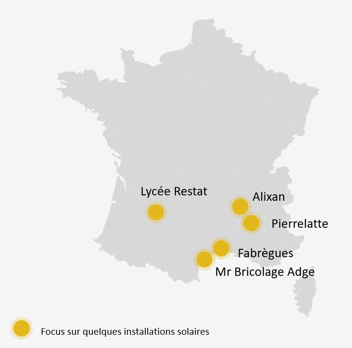 Em 2010, a Albioma inaugurou duas usinas fotovoltaicas no sul da França, uma área que goza de insolação anual elevada. A primeira está localizada em Pierrelatte, em uma área industrial de 25 hectares, e tem capacidade instalada de 7 MWp. Desde o início de suas atividades, um rebanho ovino assegura a manutenção diária do local, que conta com quase 100.000 painéis solares! A segunda usina está localizada em Fabrègues em um terreno de 4 hectares e tem capacidade instalada de 1,3 MWp. Em ambos os casos, a inserção da paisagem das instalações tem sido objeto de um cuidado particular, por exemplo, com a realização, para as instalações técnicas, de uma cobertura específica.